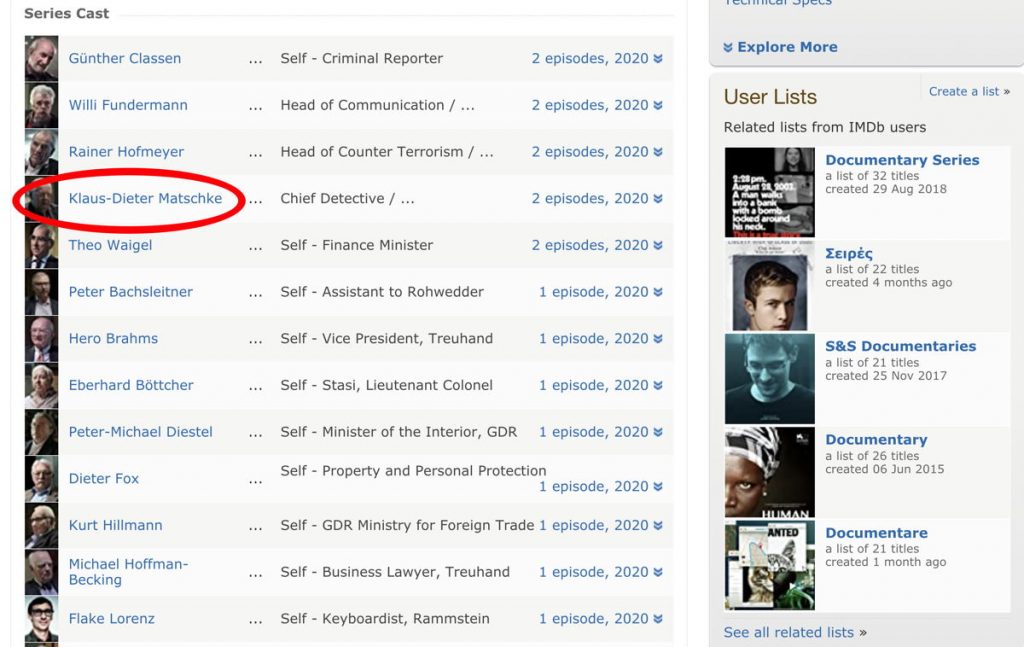 Es war mir ein Vergnügen: Als Sicherheitsexperte, Zeitzeuge und erfahrender Ostdeutschland-Ermittler in der Nachwendezeit wurde Klaus-Dieter Matsche für die Netflix-Dokumentation „Rohwedder: Einigkeit und Mord und Freiheit“ interviewt. Chief Detective KDM: In mehreren Szenen werden seine Aussagen eingespielt.
